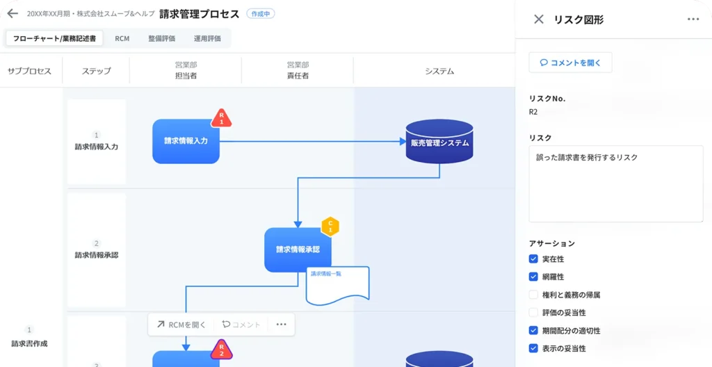 フローチャート、RCM、業務記述書の3点セット作成・更新の負担を大幅に軽減し、作成時間を50%削減※1することが可能で、フローチャートを更新すればRCMも自動反映されるため、手作業によるミスを防ぎ、効率的な運用を行えます。